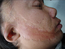 【术前烦恼】:刘先生是一名在外务工人员,由于操作电器方法不当导致电器起火,将其脸部严重烧伤。当时去往医院治疗,仅考虑伤口的愈合时间,以免耽误工作,而没有对伤口后期是否会形成疤痕这个问题引起重视。结果,烧伤部位愈合了,却留下大块疤痕。因为脸上难看的疤痕,刘先生越来越没自信。